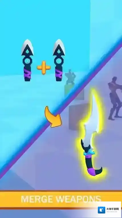 3、文字“MERGEWEAPONS”意为“合并武器”,画面展示了将两把相同武器合并成一把更高级武器的玩法。