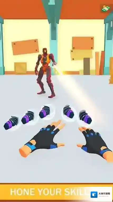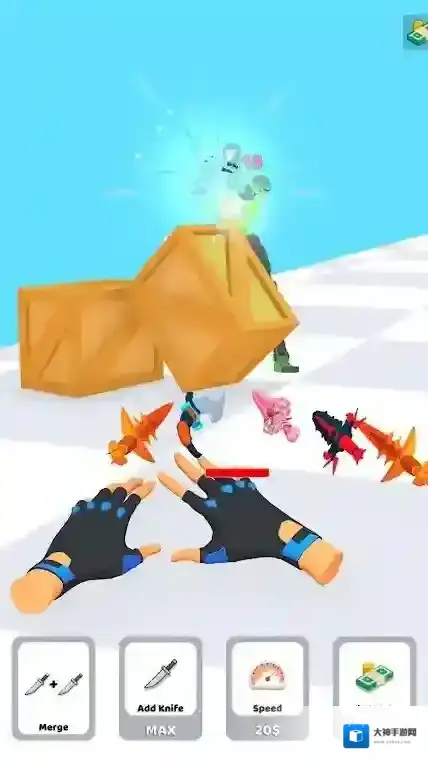 2、玩家通过手指操控向目标投掷武器,界面下方有“Merge”、“AddKnife”、“Speed”、“Income”(收入,数值100秒)等功能按钮。