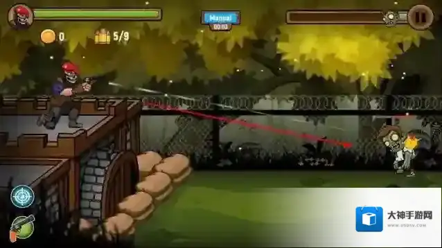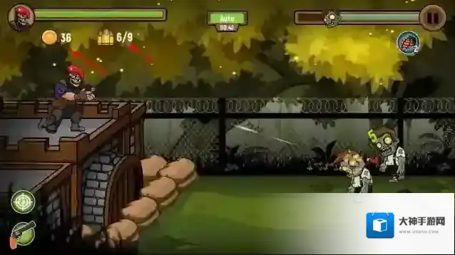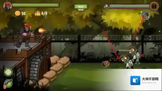3、“防御阵地”,利用武器(手枪、炸弹),阻止多波僵尸靠近堡垒,守护生存区域。