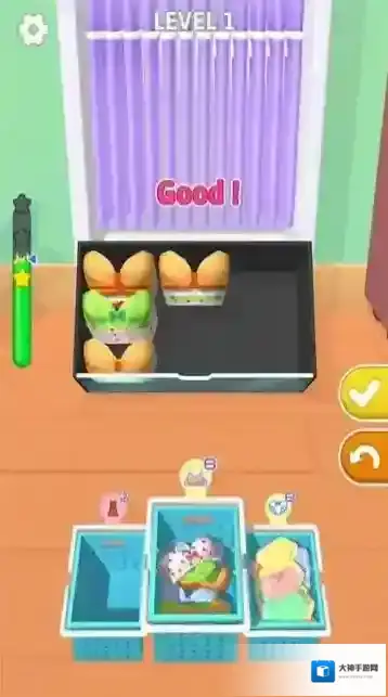 2、关卡开启后,衣柜内空白区域出现指引手势,下方弹出三类衣物篮(连衣裙、内衣、内裤),需依据指引,将对应衣物拖入衣柜指定位置,通过拖拽操作,完成衣物分类收纳。