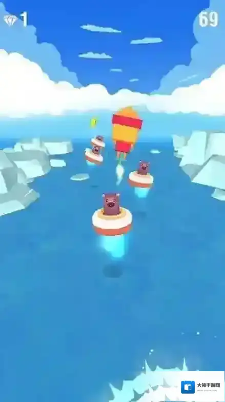 1、进入游戏,按提示左右滑动箭头指向的控制区域,调整动物堆叠塔平衡,开启冰面道路闯关。