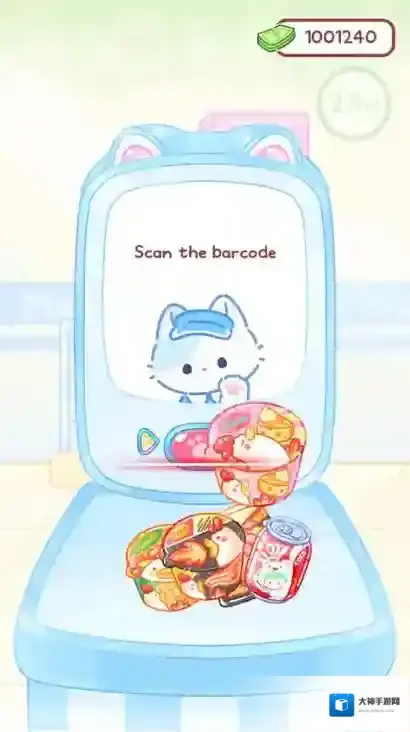 4、选好物品后点击右下角的箭头可以去结账,将物品放在中间猫爪图案附近就可以扫描结账。
