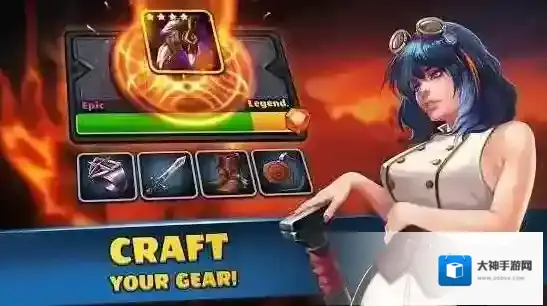 2、进入装备界面,点击箭头指向的装备打造(CRAFT-YOUR-GEAR!),消耗材料,将史诗(Epic)升为传说(Legend),强化英雄。