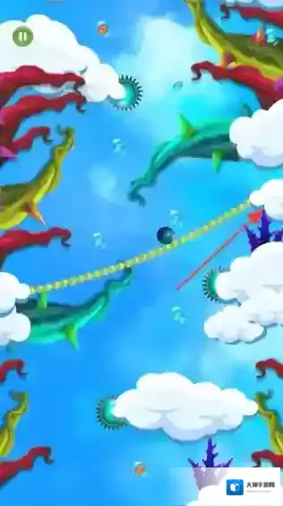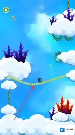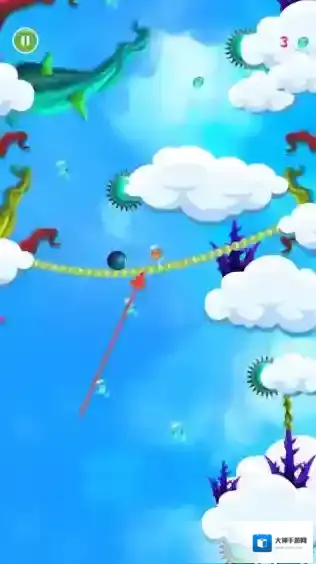 1、轻触屏幕唤醒悬浮小球,驶入首条云端绳索,微调方向保持平衡,看着脚下云海翻涌,开启首次空中平衡挑战。