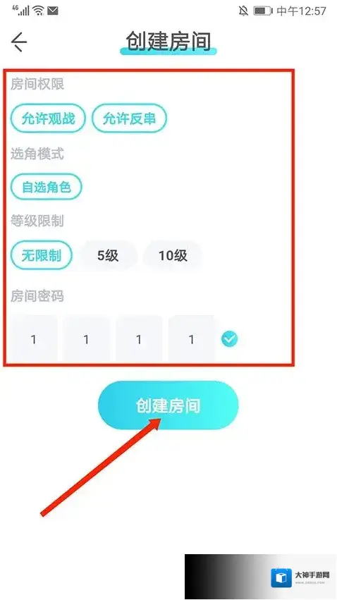 2、进入创建房间界面后,设置房间权限、选角模式、等级限制以及房间密码。