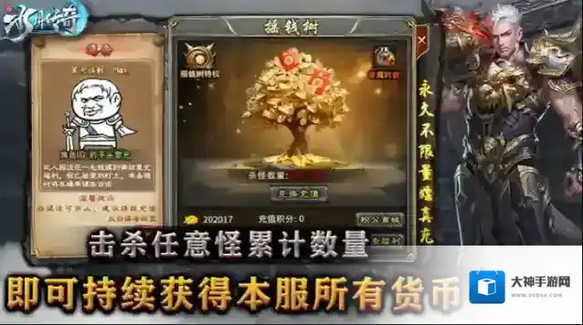 4、摇钱树:不需过多介绍,陪伴你从开局到封神的福利功能,每击杀100只任意怪即可兑换一次充值,永久不限量嫖真充和元宝。