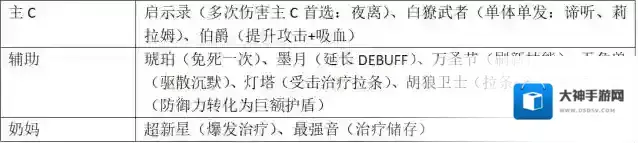 1、输出角色:T0:维克托、弥瑟亚。T0.5:炼、博尔涅。T1:夏妲、莉露摩卡、善雅、奥波尔、缇亚马特、谛听。T2:柯洛罗、罗喉。