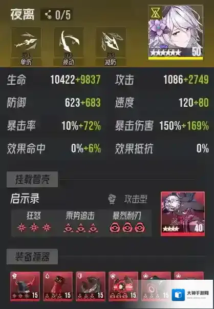 2、前期用狂怒乘势启示录,刷出狂怒乘势伯爵后就换伯爵,启示录很怕被沉默,而且暴毙几率高,稳定性不如伯爵,夜离最好2命,2命能多加8%暴击,然后爆伤越高越好,最好就是400爆伤70暴击。