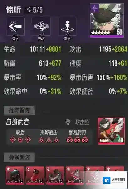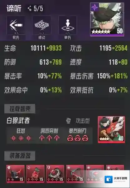 3、智壳类似于宠物,它拥有技能,被动效果,套装词条和基础属性,智壳稀有度依次从蓝色至红色共四个档,越稀有的智壳在四个维度上都会有不同程度的加强。智壳会为所装备的角色增加攻击、生命、防御以及速度四种属性。其中攻防血的属性占比并不高,但是速度是相对珍贵的属性,并且不同稀有度有着明显区分。智壳会为所装备的角色给予一个额外技能,技能效果和智壳所拥有的技能一致,智壳技能均为自动发动,无法手动对轴。被动效果为智壳突破时获得,智壳初始等级上限为10级,每次突破增加10级等级上限,最高40级。三次突破分别需要消耗1/2/3个同名智壳,也就是练满一个智壳一共需要7只,每次突破时会获得一个随机的被动技能。