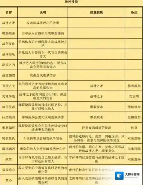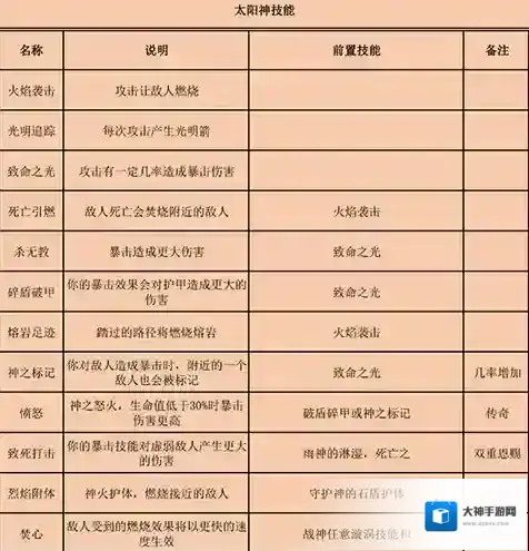 太阳神技能属于光火系。主要针对伤害提升、附属伤害、范围伤害、追踪伤害,是每个大关卡提升实力的关键技能。