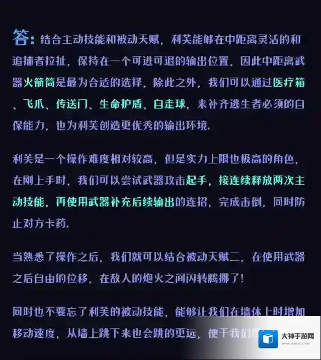 2、逃生阵营利芙是最适合裂地锤的角色,主要来自于主动技能的高伤害,使用蓄力攻击+点按+技能的组合可击倒追捕(需手速快,若三秒打不完连招追捕会自动回血导致无法击倒)同时主动技能会把追捕拉到自己身边,增加了点按的命中率。最后主动技能贴地释放,与武器跳起攻击的方式不冲突,整体搭配起来会相对丝滑。推荐卡组以裂地锤、毒液为核心,护盾用于保护自身提高容错,传送门用于逃出禁闭室或前期躲伤。使用手法毒液+蓄力+点按+技能。若辅助开门则可将毒液换成手榴弹。