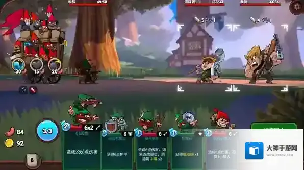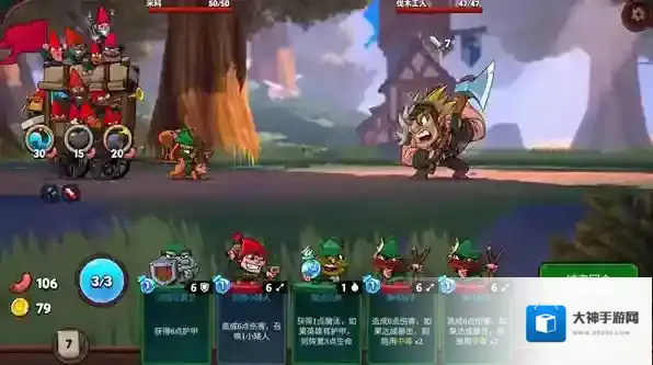 5、进入战斗后玩家需要使用不同的小矮人卡牌击败对手,每个卡牌都会消耗1点魔法,最多有3点魔法可以使用。